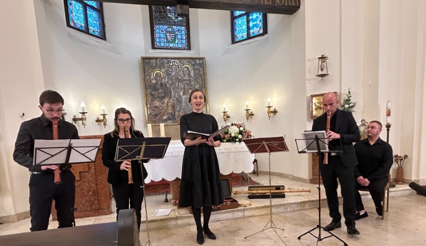 Fistulatores Novienses to zespół fletów prostych, który działa od 2016r. przy Centrum Kultury Zamek w Nowem. Jego członkowie: Emilia Kinecka, Łukasz Pendrak, Kacper Wojtyła grają na kopiach renesansowych fletów prostych (sopranino, sopran, alt g, alt f, tenor, bas, wielki bas). Zespół występował na wielu Festiwalach Muzycznych (m.in. Vratisla Cantans), jest też laureatem różnych nagród. Barbara Rogala – sopran - absolwentka Akademii Muzycznej w Łodzi. Koncertuje w Polsce i za granicą. Budapeszteński ciekawy i dobrze przez publiczność przyjęty koncert składał się z 20 utworów, rozpoczął go „Alleluia” Mikołaja z Radomia (1400-1450), a zakończył „Jezu spes mea” Stanisława Sylwestera Szarzyńskiego (1650-1713).