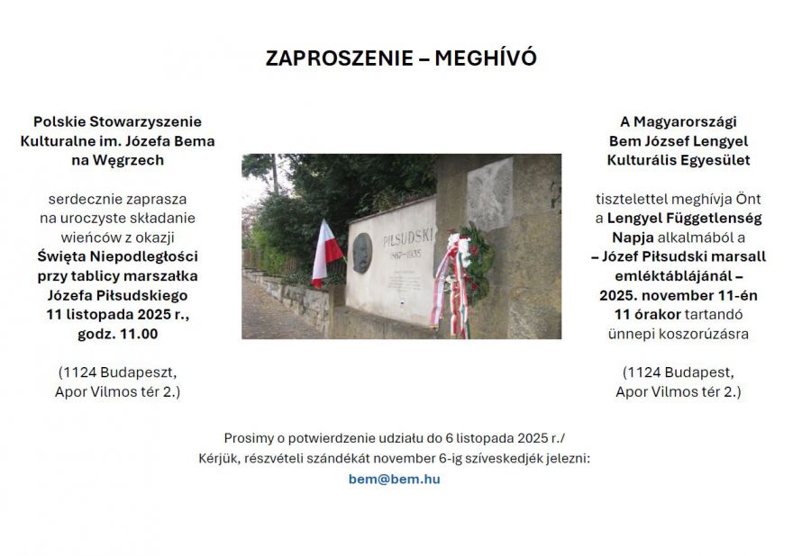 Polskie Stowarzyszenie Kulturalne im. Józefa Bema na Węgrzech serdecznie zaprasza na uroczyste składanie wieńców z okazji Święta Niepodległości przy tablicy marszałka Józefa Piłsudskiego 11 listopada 2025 r., godz. 11.00 (1124 Budapeszt, Apor Vilmos tér 2.)