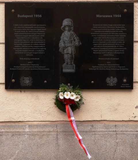 1956-ban pedig a leggyorsabb és legnagyobb humanitárius segítség Lengyelországból érkezett, s a budapesti nemzetőrök karszalagját lengyel diákok is felhúzták. örök dicsőség emléküknek! 2015 – Bethlen Gábor Alapítvány, Pesti Srácok Alapítvány, Budapest VIII. Kerületének Önkormányzata, Országos Lengyel Kisebbségi Önkormányzat.”